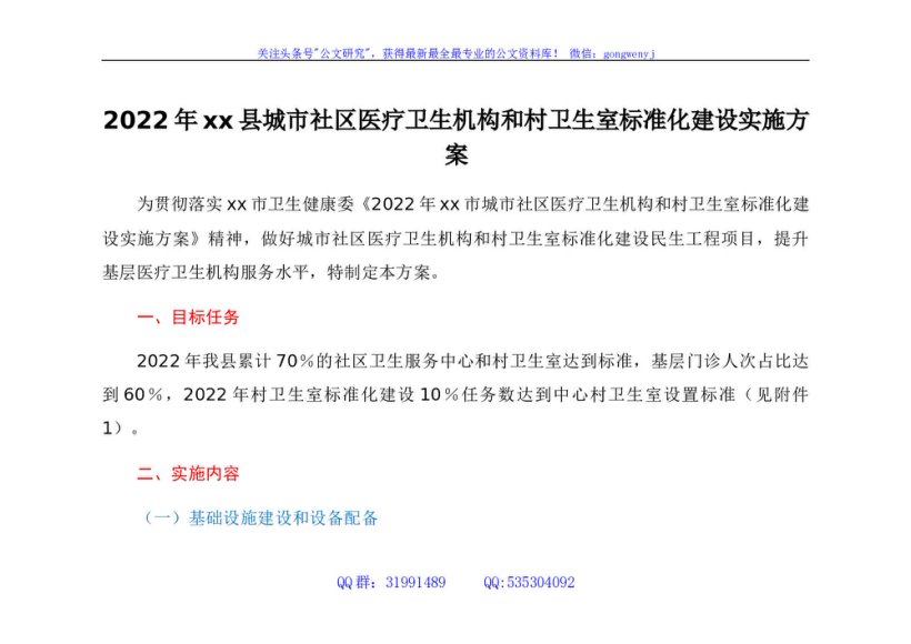 / 2022年xx县城市社区医疗卫生机构和村卫生室标准化建设实施方案