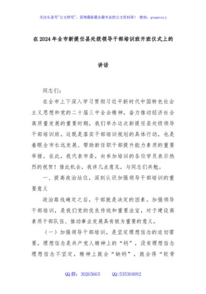 在2024年全市新提任县处级领导干部培训班开班仪式上的讲话