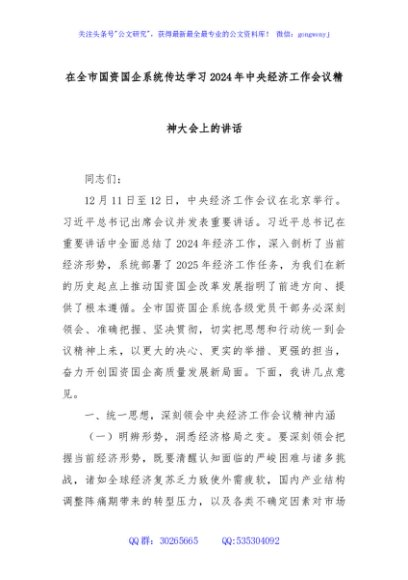 / 在全市国资国企系统传达学习2024年中央经济工作会议精神大会上的讲话