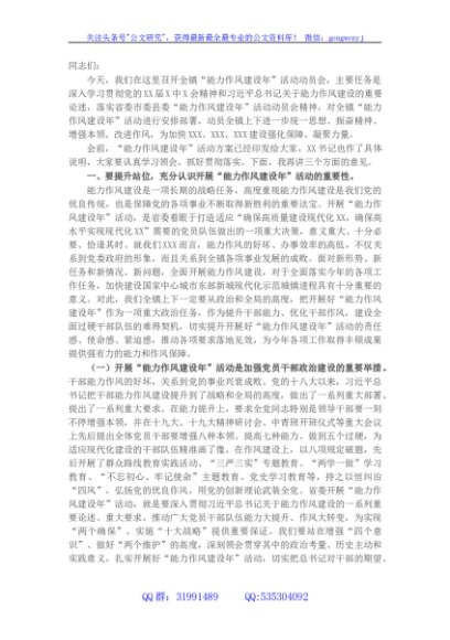 / 镇党委书记在全镇“能力作风建设年”活动动员部署会上的讲话
