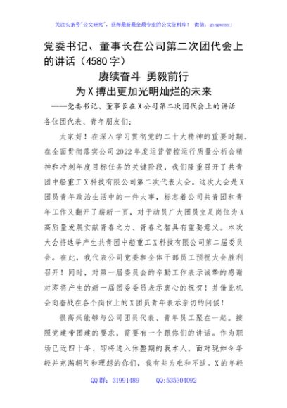 / 国企党委书记、董事长在公司第二次团代会上的讲话