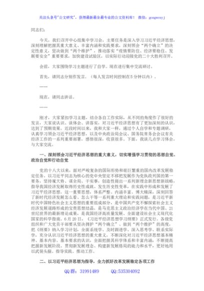 / 党委书记在2022年中心组经济思想学习会上的主持讲话