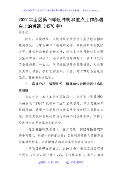 / 2022年全区第四季度冲刺和重点工作部署会上的讲话