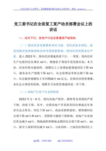 / 2022年在全面复工复产动员部署会议上的讲话