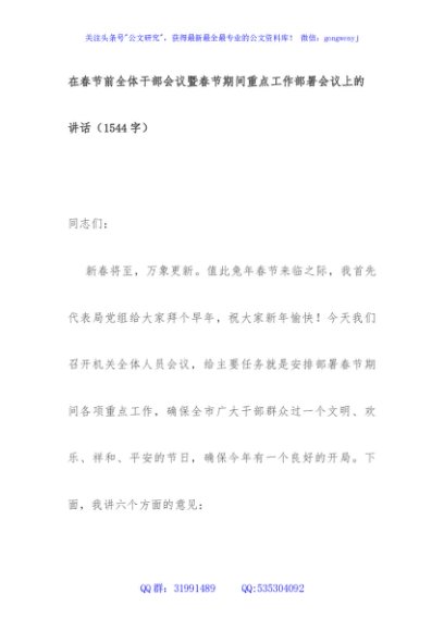 / 在春节前全体干部会议暨春节期间重点工作部署会议上的讲话