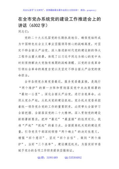 / 在全市党办系统党的建设工作推进会上的讲话