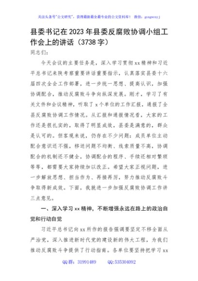 / 县委书记在2023年县委反腐败协调小组工作会上的讲话