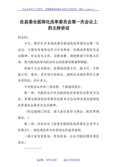 / 在县委全面深化改革委员会第一次会议上的主持讲话
