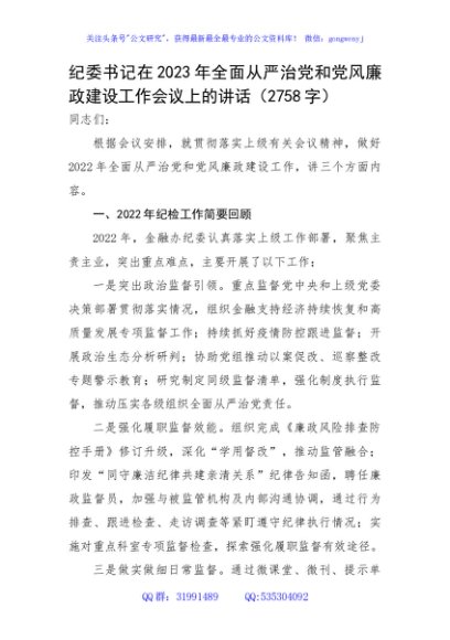 / 纪委书记在2023年全面从严治党和党风廉政建设工作会议上的讲话