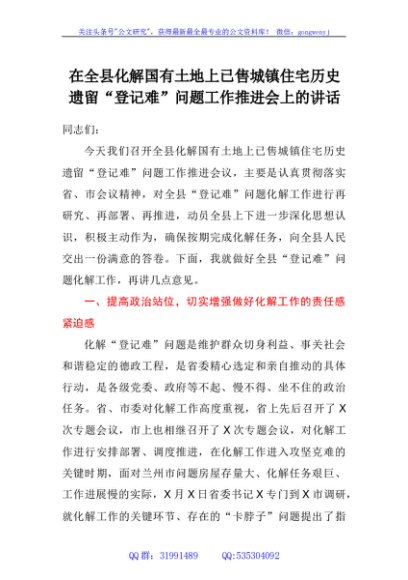 / 在全县化解国有土地上已售城镇住宅历史遗留“登记难”问题工作推进会上的讲话