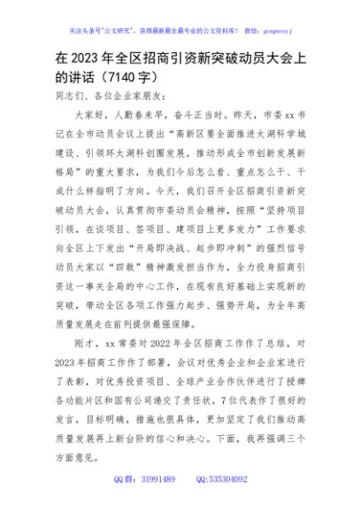 / 在2023年全区招商引资新突破动员大会上的讲话