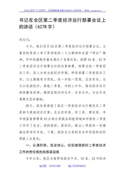 / 书记在全区第二季度经济运行部署会议上的讲话