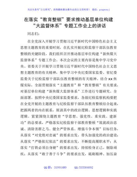 / 在落实“教育整顿”要求推动基层单位构建“大监督体系”专题工作会上的讲话(国企)