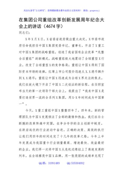 / 国企重组改革创新发展周年纪念大会上的讲话