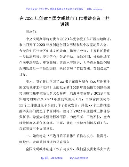 / 在2023年创建全国文明城市工作推进会议上的讲话