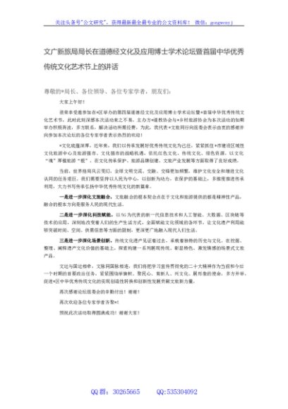 / 文广新旅局局长在道德经文化及应用博士学术论坛暨首届中华优秀传统文化艺术节上的讲话