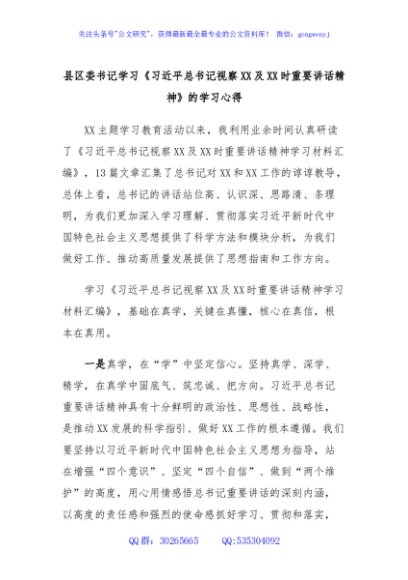 / 县区委书记学习《习近平总书记视察XX及XX时重要讲话精神》的学习心得