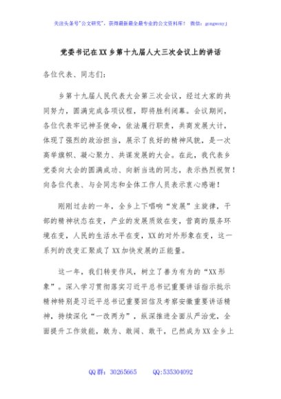 / 党委书记在XX乡第十九届人大三次会议上的讲话