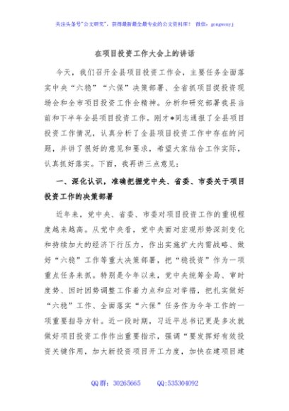 / 在项目投资工作大会上的讲话