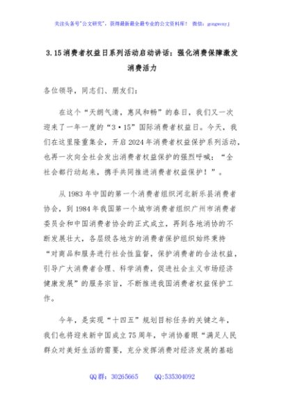 / 3.15消费者权益日系列活动启动讲话:强化消费保障激发消费活力