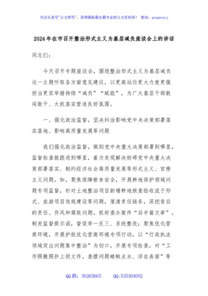 / 2024年在市召开整治形式主义为基层减负座谈会上的讲话