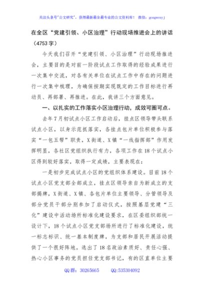 / 在全区“党建引领、小区治理”行动现场推进会上的讲话