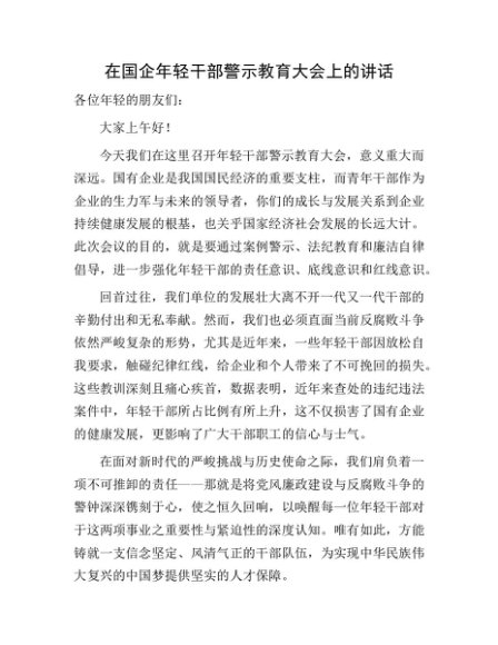/ 在国企公司年轻干部警示教育大会上的讲话