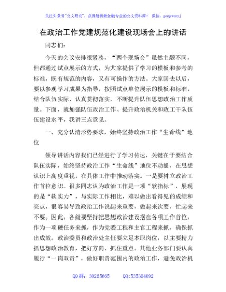 / 在政治工作党建规范化建设现场会上的讲话