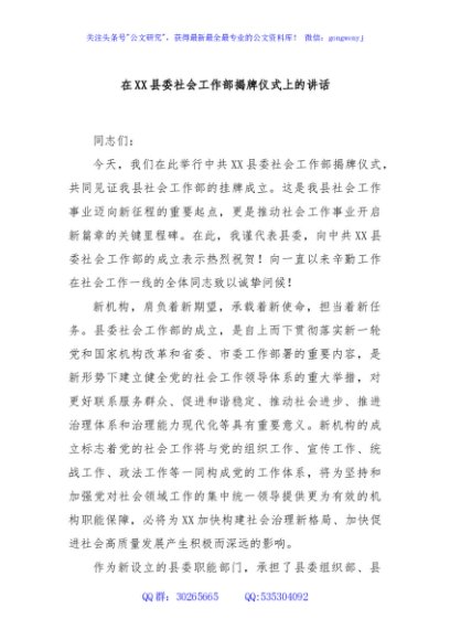 / 在XX县委社会工作部揭牌仪式上的讲话