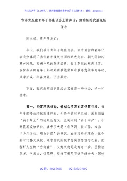 / 市局党组在青年干部座谈会上的讲话:建功新时代展现新作为