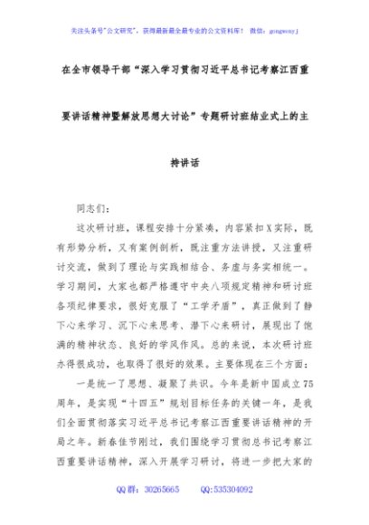 / 在全市领导干部“深入学习贯彻习近平总书记考察江西重要讲话精神暨解放思想大讨论”专题研讨班结业式上的主持讲话