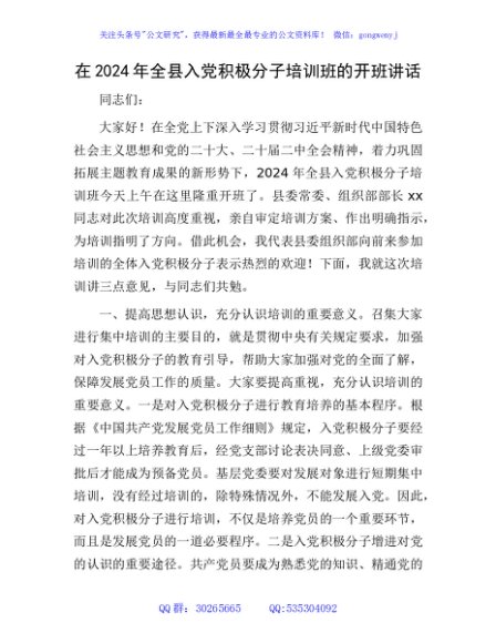 / 在2024年全县入党积极分子培训班的开班讲话