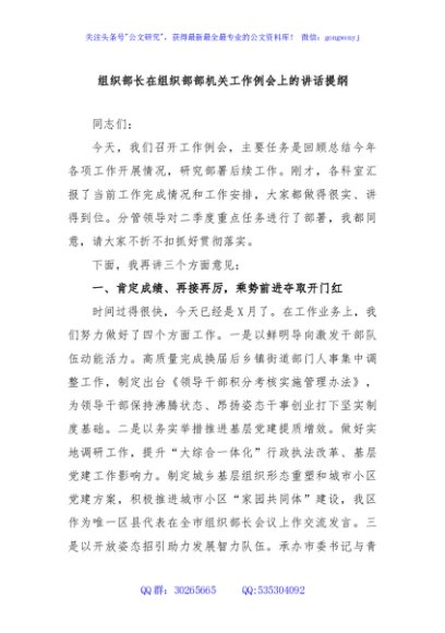 / 组织部长在组织部部机关工作例会上的讲话提纲