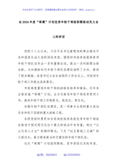 / 在2024年度“琢璞”计划优秀年轻干部挂职锻炼动员大会上的讲话