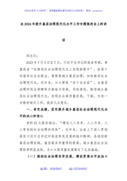 / 在2024年提升基层治理现代化水平工作专题推进会上的讲话
