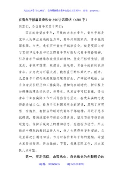/ 在青年干部廉政座谈会上的讲话提纲(4281字)
