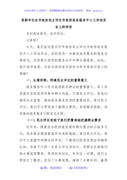/ 某副市长在市政协民主评议市政府政务服务中心工作动员会上的讲话