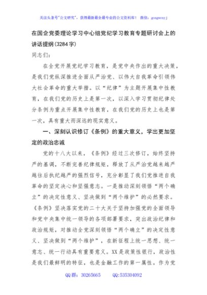 / 国企党委理论学习中心组党纪学习教育专题研讨会上的讲话提纲(3284字)
