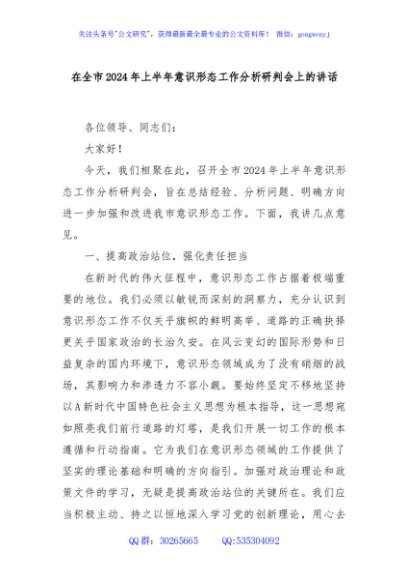 / 在全市2024年上半年意识形态工作分析研判会上的讲话