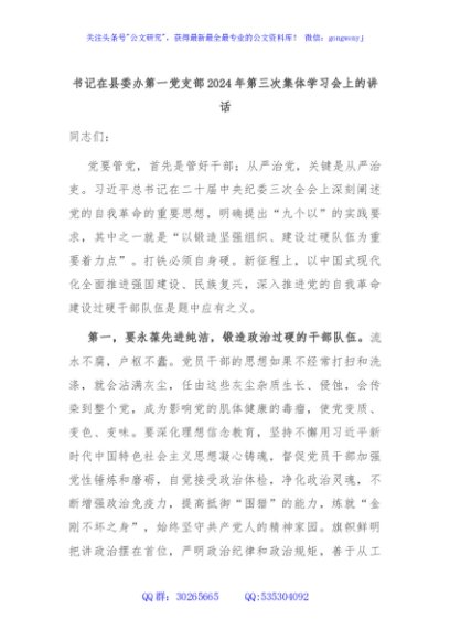/ 书记在县委办第一党支部2024年第三次集体学习会上的讲话