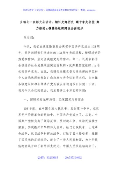 乡镇七一表彰大会讲话:缅怀光辉历史 踊于争先创优 努力推进x镇基层组织建设全面进步