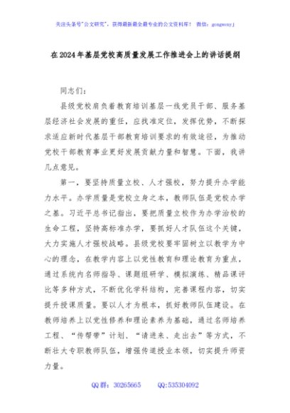/ 在2024年基层党校高质量发展工作推进会上的讲话提纲