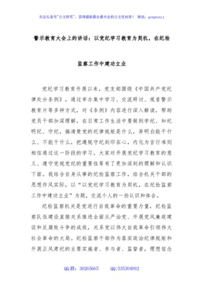 / 警示教育大会上的讲话:以党纪学习教育为契机,在纪检监察工作中建功立业