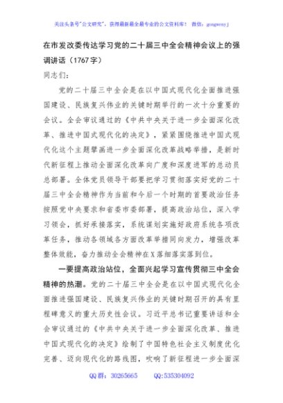 / (传达讲话)在市发改委传达学习党的二十届三中全会精神会议上的强调讲话(1767字)