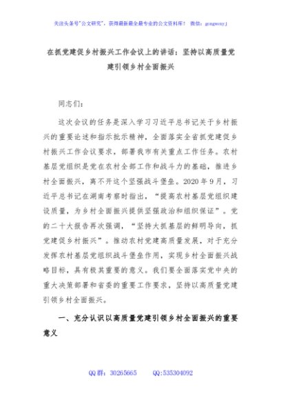 / 在抓党建促乡村振兴工作会议上的讲话:坚持以高质量党建引领乡村全面振兴