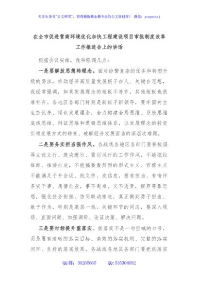 / 在全市促进营商环境优化加快工程建设项目审批制度改革工作推进会上的讲话