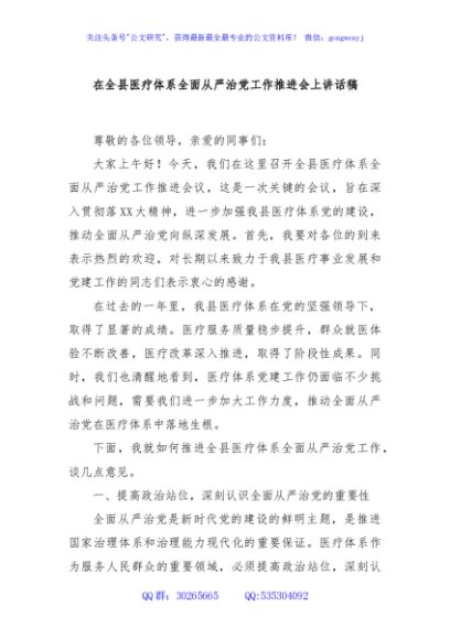 / 在全县医疗体系全面从严治党工作推进会上讲话稿