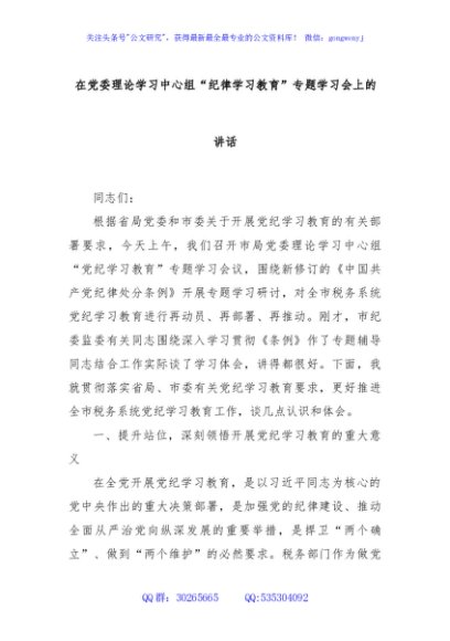 / 在党委理论学习中心组“纪律学习教育”专题学习会上的讲话