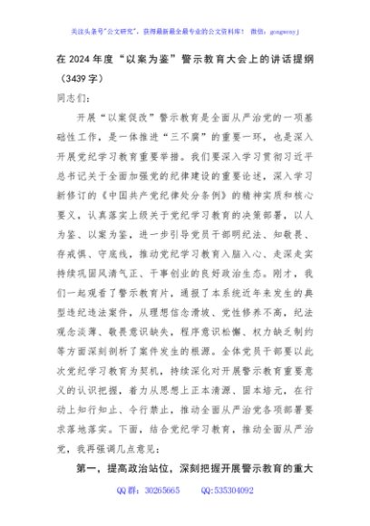 / 在2024年度“以案为鉴”警示教育大会上的讲话提纲(3439字)