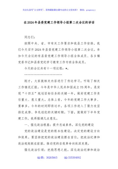 / 在2024年县委党建工作领导小组第二次会议的讲话